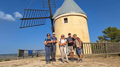 Les sacs allégés et les ventres lourds nous avons atteint les premières maisons bâties dans une grande pinède après la longue montée du Puech Long. Sur les hauteurs de Langlade se dresse un moulin à vent restauré à l’authentique : le Moulin Cavalier. L’origine en remonte au XIIIe siècle. Il était destiné à moudre les céréales cultivées dans la plaine jusqu’à ce qu’elles soient remplacées par la culture de la vigne, plus rentable. Après le moulin nous avons poussé jusqu’à l’église Saint Julien Saint-Jean Bosco. Cette église, de construction récente, remplaça l’église Saint-Julien (située plus bas, dans le centre du village) datant du Moyen-Âge qui fut donnée définitivement aux protestants par un décret du 8 Germinal an XI (29 mars 1803). Sans trop nous attarder devant cette église, nous avons rejoint le temple protestant par une petite rue bordée de vieilles maisons. Ce temple est donc à l’origine une église fortifiée surmonté d’un clocher carré pourvu d’un beau campanile.