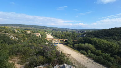 En ce matin du mardi 24 septembre, le ciel était couvert mais la météo ne prévoyait pas de pluie. Nous étions 9 au départ de l'église de Russan-Sainte-Anastasie. La randonnée débutait par une montée accentuée pour rejoindre le plateau qui domine les gorges creusées par le Gardon. À la fin de la montée, quelques fines gouttes de crachin nous ont inquiétés, quelques K-ways sont sortis des sacs, mais l'alerte fut de courte durée et, entre les cumulus, le soleil a fait quelques percées. Après un passage par un petit castellas dont il ne reste pas grand chose, nous avons fait une pause-café sur un promontoire qui domine l'ensemble des gorges. Après une progression sur le plateau avec tout de même des montées et des descentes nous avons piqueniqué au bord de la falaise, en vue du pont Saint-Nicolas, point le plus à l'est du tracé. Le retour s'est effectué par une montée en pente douce vers le village de Vic, puis un dernier coup de collier pour franchir le ressaut qui nous séparait du point de départ.